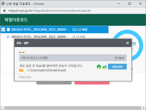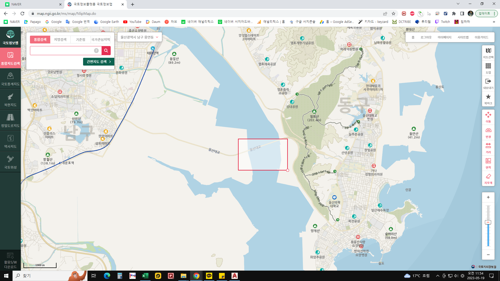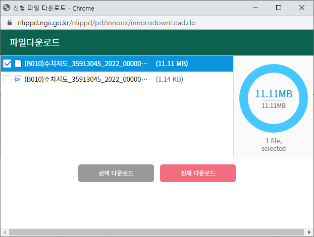 파란 영역이 선택 되고 수치지도를 찾을수 있다. 이후 다운로드는 앞서 설명에서 언급했으므로 따로 하지 않겠다.