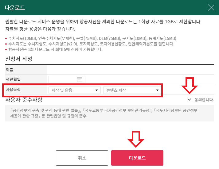 사용 목적을 작성하고 동의 한뒤 다운로드 해준다.